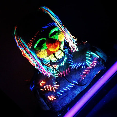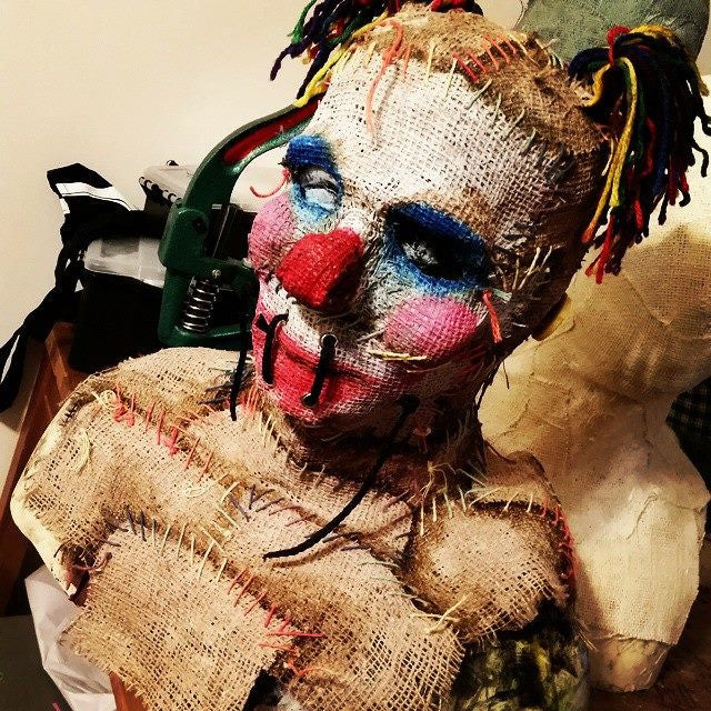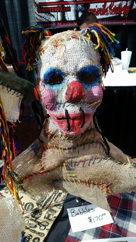 Babbles is a full head burlap and latex mask. She has yarn pigtails and multicolor stitching! She laces up the back with large eyelets and nylon cord. Fully customizable, email us for details or with any questions!