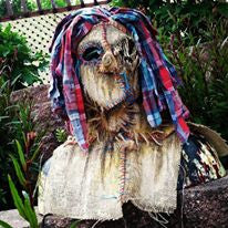 DeadRick is a full head burlap and latex mask. He has Punched Fabric Hair. He laces up the back with large eyelets and nylon cord. Fully customizable, email us for details or with any questions!
