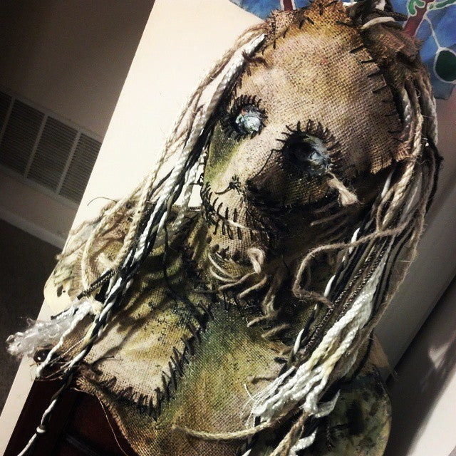 Drags is a full head burlap and latex mask. He has Rope and Twine Dreads. He laces up the back with large eyelets and nylon cord. Fully customizable, email us for details or with any questions!