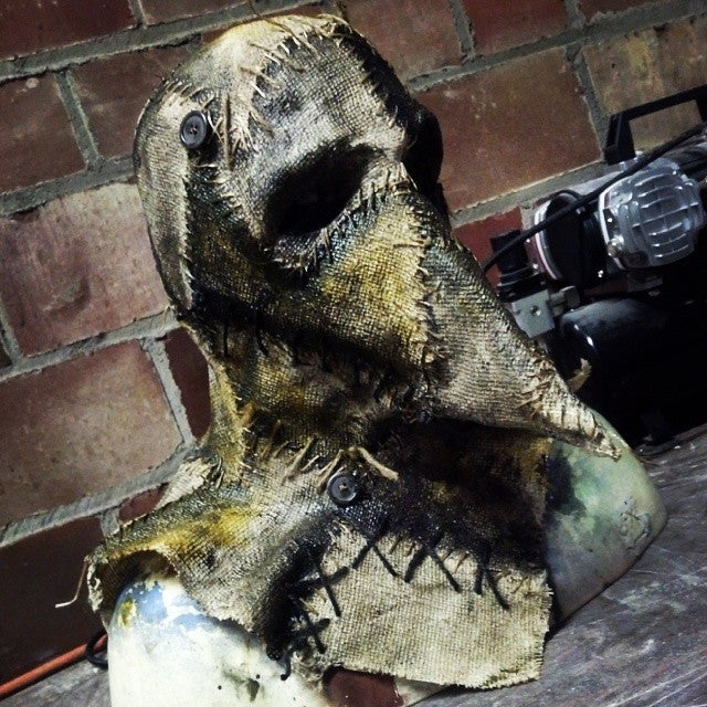 Influenza is a full head burlap and latex mask. He has a rigid beak and lots of detail stitching. He laces up the back with large eyelets and nylon cord. Fully customizable, email us for details or with any questions!
