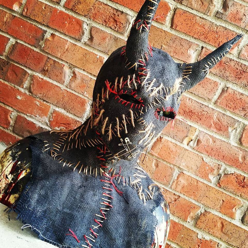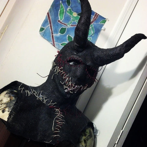 Kane is a full head burlap and latex mask. He has rigid horns and lots of detail stitching. He laces up the back with large eyelets and nylon cord. Fully customizable, email us for details or with any questions!