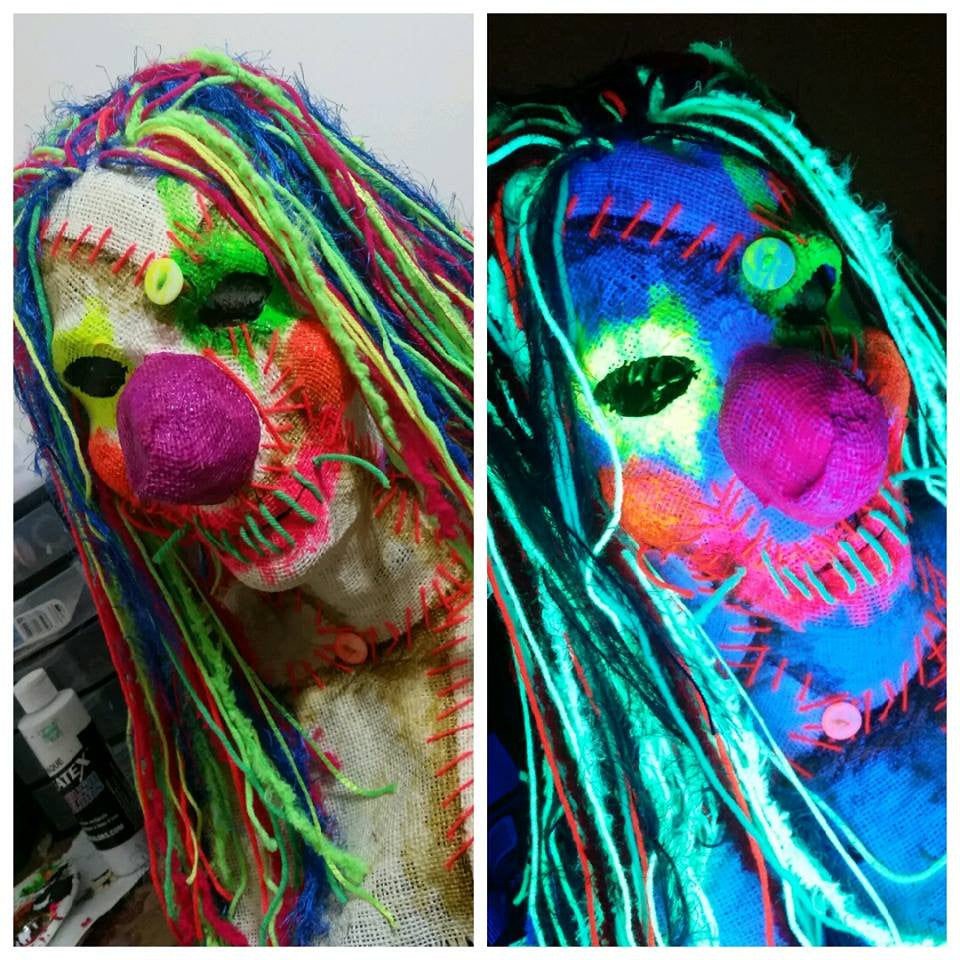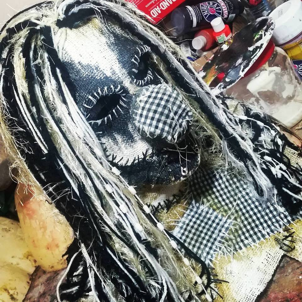 Sprinkles is a full head burlap and latex mask. He has punched Yarn Hair. He laces up the back with large eyelets and nylon cord. Fully customizable, email us for details or with any questions!