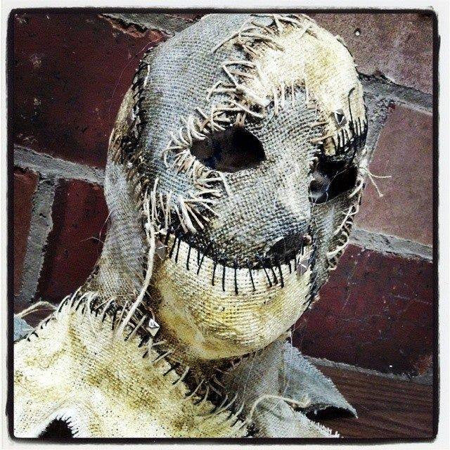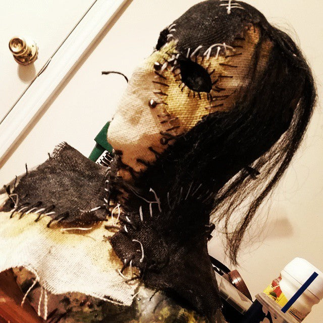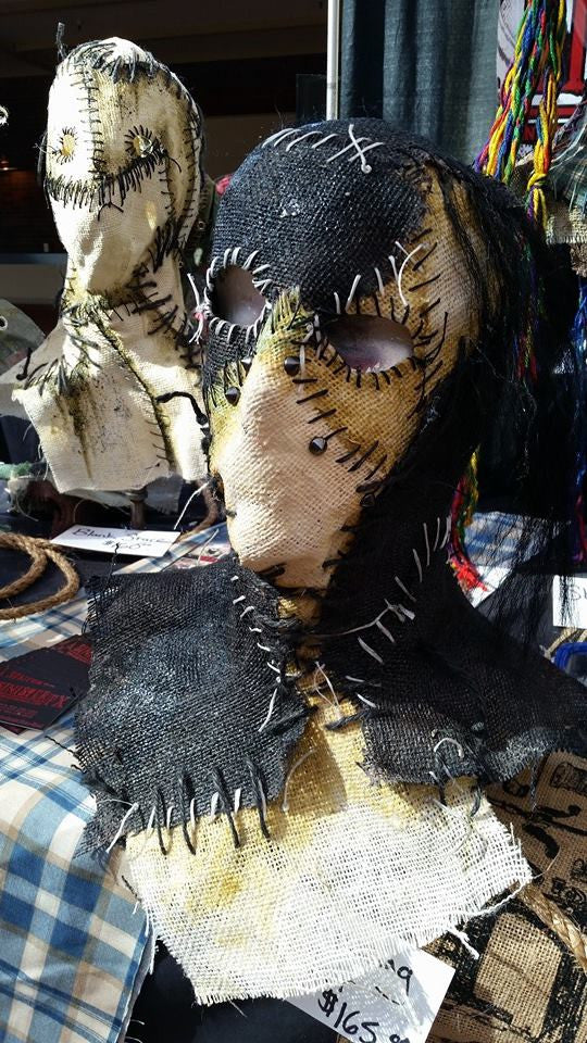 The Missing is a full head burlap and latex mask. She has lots of detail stitching. She laces up the back with large eyelets and nylon cord. Fully customizable, email us for details or with any questions!
